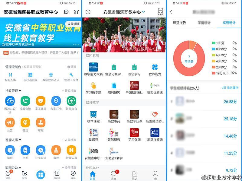 根据《安徽省中职学校冠状病毒肺炎疫情防控开学工作指南(一)》、《安徽省中等职业学校新冠肺炎疫情防控开学工作指南(二)》皖教秘〔2020〕50号》,学校教科研等部门要加强与各级教研机构、公共教学服务平台联动,积极开展在线教学研究,为任课教师遴选教学资源提供支持和帮助。根据《安徽省中等职业学校线上教学工作指南(三)》皖教秘〔2020〕63号,做好学校网络和相关设施设备的保障,确保可以正常访问各类网上教学资源,做好学校网上教学资源的技术指导与服务工作。根据《关于切实做好淮北市中等职业学校新冠肺炎疫情防控期间线上教学工作的通知》淮教〔2020〕16号,广泛采用钉钉平台系统、微信、QQ等多种互动在线教学方式。根据《教育部办公厅关于严禁有害APP进入中小学校园的通知》教基厅函〔2018〕102号文件要求,提供技术支持分析讨论,供师生使用。